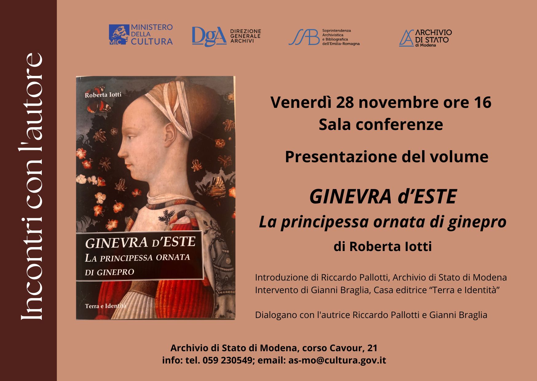 In programma venerdì 28 novembre alle ore 16, presso la Sala conferenze dell'Archivio di Stato di Modena la presentazione del volume "Ginevra d'Este, la principessa ornata di ginepro" di Roberta Iotti.